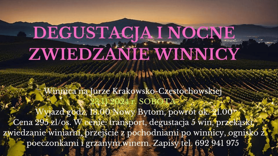 23.11.2024 20:00W sobotę 23 listopada o godz.13.00 wyjedziemy z umówionego miejsca na Nowym Bytomiu by skierować się ku pięknej winnicypołożonej w malowniczym miejscu na Jurze Krakowsko-Częstochowskiej gdzie będziemy mieli mega ciekawy program!Najpierw zapoznamy się z winiarzem, winiarnią i winnicą za dnia, poznamy proces produkcji jurajskiego wina, potem zdegustujemy 5 win wraz z lokalnymi przekąskami (sery od lokalnego serowara, swojskie pieczywko ze smalczykiem i ogórkiem itp.) a następnie po zmroku odbędziemy spacer po winnicy z pochodniami gdzie na koniec uraczeni zostaniemy pieczonkami z ogniska i grzanym winem!