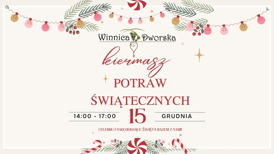Serdecznie zapraszamy na wyjątkowy Kiermasz Potraw Świątecznych w Winnicy Dworskiej! To doskonała okazja, by w świątecznym klimacie spędzić czas z rodziną i bliskimi.