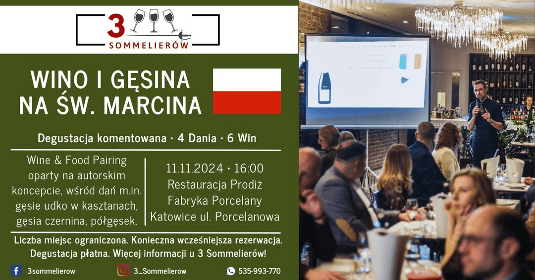 Zapraszamy na niezwykłe wydarzenie w Święto Niepodległości 11 Listopada. Kolacja Degustacyjna "Wino i Gęsina na św. Marcina" to celebracja staropolskich tradycji kulinarnych i winiarskich.