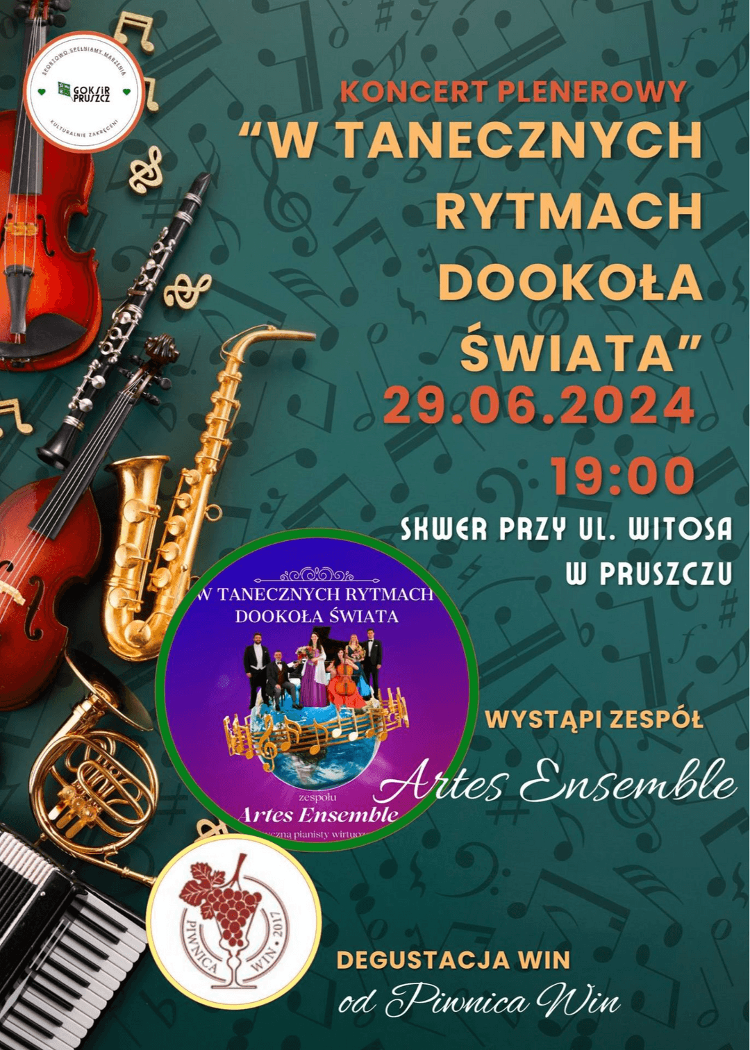 28.06.2024 22:00Już w tą sobotę 29.06.2024 o godzinie 19:00 zapraszamy Państwa Serdecznie na wyjątkowy koncert pt. "W tanecznych rytmach dookoła Świata" w wykonaniu wspaniałego zespołu Artes Ensemble pod dyrekcją artystyczną pianisty wirtuoza, Andrzej Janaszek. Muzyczna podróż dookoła świata w rytmach najpopularniejszych i najbardziej charakterystycznych dla różnych krajów świata - tańców. Absolutnie zachwycający, tryskający pozytywną energią i letnią radością kostiumowy koncert - widowisko muzyczne, z porywającymi do tańca przebojami! Podczas koncertu będzie można również degustować wina od Piwnica Win 2017, jak również zakupić zasmakowany egzemplarz.