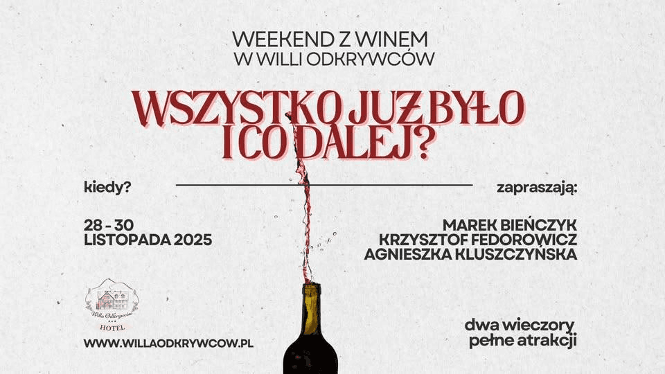 to tradycja dla tych, którzy wino traktują nie tylko jako trunek, ale jako pretekst do rozmów o życiu, literaturze i poszukiwaniu sensu. Tym razem trójka wyjątkowych Gości - pisarz i enolog Marek Bieńczyk, winiarz i poeta Krzysztof Fedorowicz oraz Ta Babka od Wina Agnieszka Kluszczyńska – postawią pytanie: wszystko już było i co dalej?