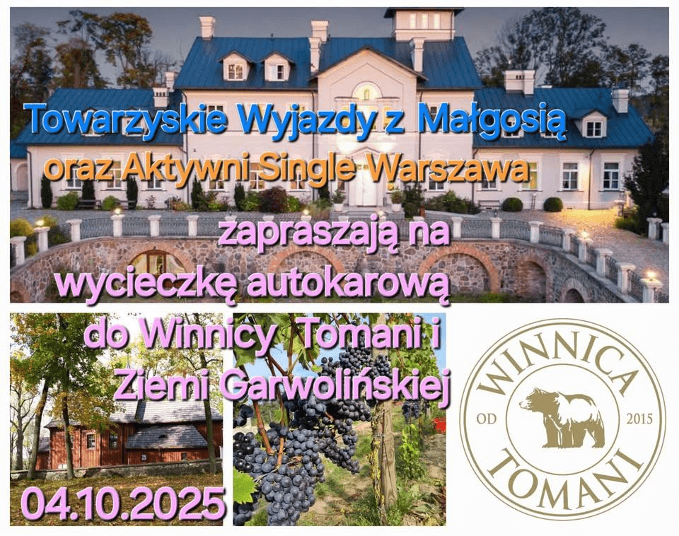 04.10.2025 16:00Zapraszamy Was bardzo serdecznie na jesienną wycieczkę autokarową do Winnicy Tomani oraz po najpiękniejszych zabytkach Ziemi Garwolińskiej.