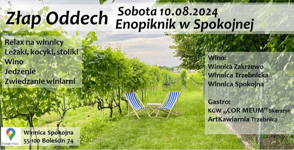 10.08.2024 19:00Na terenie winnicy będą zorganizowane miejsca do odpoczynku.